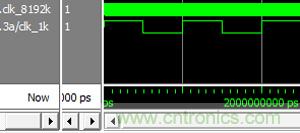 根據(jù)所需的時(shí)鐘頻率為1kHz的時(shí)鐘,而晶振時(shí)鐘的頻率為8192kHz,晶振時(shí)鐘與所需的時(shí)鐘頻率恰巧是8192倍的整數(shù)倍關(guān)系,因此需要對8192kHz的晶振時(shí)鐘進(jìn)行8192分頻來獲得所需要的時(shí)鐘。根據(jù)整數(shù)倍分頻器的設(shè)計(jì)方法原理,通過ISE9.1邏輯設(shè)計(jì)工具,利用VHDL硬件描述語言來進(jìn)行8192分頻的分頻器設(shè)計(jì)。然而8192又是偶數(shù),所以需要設(shè)計(jì)的是偶數(shù)分頻器。對設(shè)計(jì)的內(nèi)容通過Modelsim6.5仿真軟件進(jìn)行仿真驗(yàn)證,結(jié)果如圖3-4所示。
