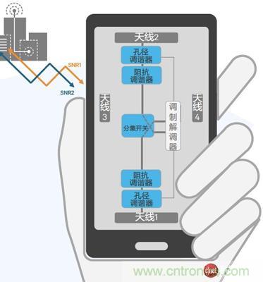 值得一提的是,高通的整合解決方案還支持載波聚合的TruSignal自適應(yīng)天線調(diào)諧技術(shù)。TruSignal可被看作是三項(xiàng)技術(shù)的總稱:第一是主分集天線切換,它是用來(lái)解決手機(jī)“死亡之握”的問(wèn)題——手機(jī)的主天線一般是在手機(jī)的下方,當(dāng)人們用手握住它的時(shí)候,信號(hào)會(huì)掉得非常快,當(dāng)下方主天線被握死時(shí),它可以將天線切換到上面的分集天線去;第二是天線調(diào)諧——天線調(diào)諧技術(shù)又包含兩類,一類叫孔徑調(diào)諧,一類叫阻抗調(diào)諧,通過(guò)調(diào)諧天線的匹配,可以解決天線和PA之間的適配問(wèn)題;第三是高階分集接收——通過(guò)增加分集來(lái)提升接收性能,以及接收的下行速率。