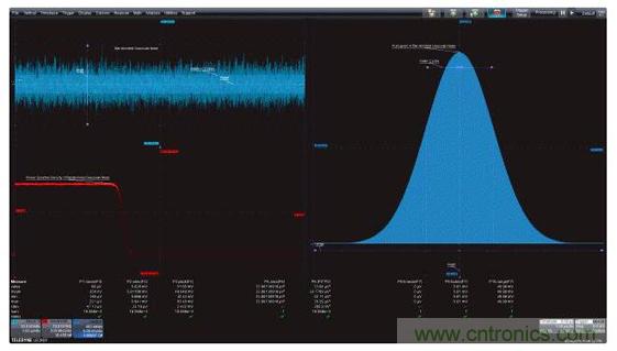 圖1:左上圖是帶寬受限的高斯噪聲的時域圖,左下圖是功率譜密度,是帶寬受限噪聲的頻域圖;右面的柱狀圖是帶寬受限噪聲的統(tǒng)計圖。這三個視圖都因采用了有助于對測量進行量化的測量參數(shù)而得到增強。