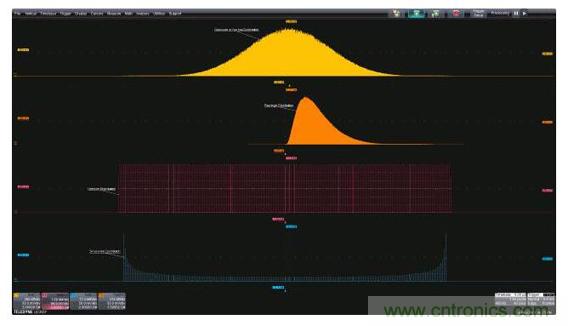在許多應用中,兩個或多個隨機過程可能發(fā)生交互。當這種情況發(fā)生時,過程的概率密度會進行數(shù)學卷積運算。一個常見的例子是結合了隨機和確定性抖動分量的時序抖動。圖5顯示了結合在一起的高斯和正弦分量,源分布位于上面兩張圖,從上往下數(shù)的第三張分布圖是兩個源卷積的結果。許多先進的示波器提供可選的抖動或噪聲分析包,這些分析包可以將這些組合式分布分開,單獨測量分量。