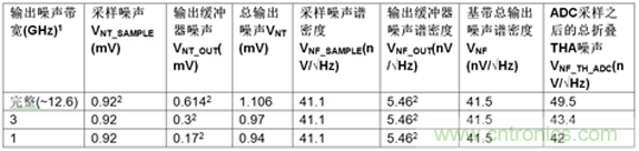 在采樣過(guò)程中,下游ADC將輸入帶寬(表1和表2中所示的濾波和ADC輸入帶寬的組合)上的所有THA噪聲外差到一個(gè)ADC奈奎斯特區(qū)間。因此,總折疊噪聲是ADC噪聲帶寬上的總THA輸出放大器時(shí)域噪聲的一部分。