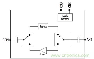 圖 1: Skyworks 的 SKY66113-11 將 LNA 與數(shù)字控制集成。該器件還使用了旁路開關(guān),讓系統(tǒng)可以根據(jù)需要在無 LNA 的情況下工作。(圖片來源: Skyworks)