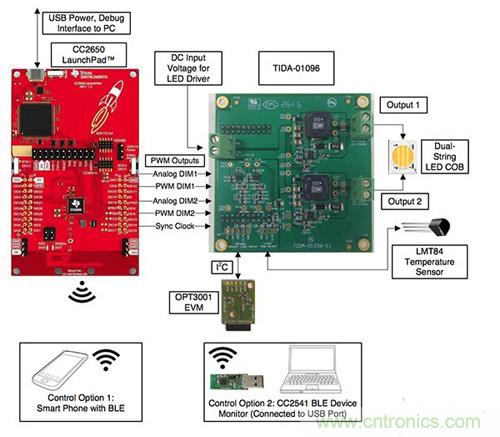 圖 5 顯示了如何使用與 SimpleLink CC2650 LaunchPad 配對的 TIDA-01096 來配置基于參考設(shè)計(jì)的 LED 照明解決方案的硬件。該項(xiàng)目的固件是由 TI 作為代碼調(diào)試器項(xiàng)目開發(fā)的,可根據(jù)要求提供。
