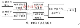 多傳感器數(shù)據(jù)融合在運(yùn)用過(guò)程的各階段(例如模型建立、特征提取、目標(biāo)識(shí)別等)需要各種各樣的傳感器。由于沒(méi)有哪一類傳感器的各種性能指標(biāo)都絕對(duì)比其他類型傳感器好,因此在一個(gè)系統(tǒng)中,需要同時(shí)采用多種類型的傳感器,以提高系統(tǒng)檢測(cè)、識(shí)別、分類和決策能力。本文根據(jù)系統(tǒng)的需要使用了兩類傳感器:電磁感應(yīng)式傳感器和霍爾傳感器,利用它們之間產(chǎn)生的冗余信息進(jìn)而檢測(cè)出缺陷信號(hào)。數(shù)據(jù)融合系統(tǒng)結(jié)構(gòu)如圖1所示。