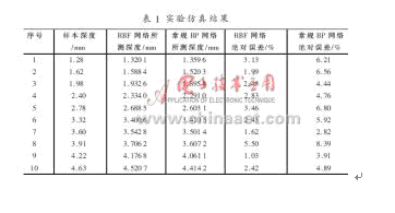 本文采用MATLAB軟件進(jìn)行仿真實(shí)驗(yàn),通過(guò)提供的40組人工裂縫的樣本,對(duì)RBF神經(jīng)網(wǎng)絡(luò)系統(tǒng)進(jìn)行訓(xùn)練學(xué)習(xí)和模式識(shí)別,并在學(xué)習(xí)初期對(duì)輸入數(shù)據(jù)進(jìn)行了預(yù)處理,通過(guò)樣本訓(xùn)練逐漸生成最佳的RBF期網(wǎng)絡(luò)[8]。另取10組測(cè)試樣本數(shù)據(jù)作為輸入,用MATLAB軟件進(jìn)行模擬仿真,同時(shí)利用RBF神經(jīng)網(wǎng)絡(luò)對(duì)其進(jìn)行深度評(píng)估,并與常規(guī)BP神經(jīng)網(wǎng)絡(luò)進(jìn)行對(duì)比,其實(shí)驗(yàn)仿真結(jié)果如表1所示。