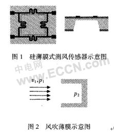 硅薄膜式測(cè)風(fēng)傳感器的設(shè)計(jì)示意圖如圖1所示。薄膜式風(fēng)速風(fēng)向傳感器主要是利用風(fēng)吹薄膜對(duì)薄膜產(chǎn)生風(fēng)壓,風(fēng)壓導(dǎo)致薄膜形變,薄膜上的應(yīng)變電阻就會(huì)感應(yīng)到薄膜的形變。通過(guò)測(cè)量應(yīng)變電阻的變化即可解算出風(fēng)速大小。設(shè)定測(cè)量時(shí)風(fēng)正面吹向薄膜如圖2所示。