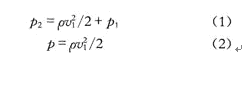 圖2中:υ1表示風(fēng)的平均流速;p1表示風(fēng)流的壓力;p2表示薄膜所受的壓力,應(yīng)用流體力學(xué)中理想伯努力方程如式(1)。其中p為空氣的密度,化簡(jiǎn)后可以得出薄膜承受絕對(duì)壓強(qiáng)p的變化與風(fēng)速的關(guān)系如式(2),即