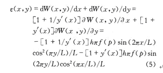 p是作用在膜上的絕對(duì)壓強(qiáng);E和υ分別為薄膜材料的楊氏模量和泊松比。材料的形變定義為單位長(zhǎng)度材料的變化。設(shè)ε(x,y)是薄膜的應(yīng)變函數(shù),可以用式(5)來(lái)計(jì)算,則