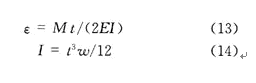懸梁的應(yīng)變通過(guò)式(13)來(lái)計(jì)算,E是楊氏模量,I是慣性矩。慣性矩計(jì)算公式是式(14),t是懸梁的厚度,ω是懸梁的寬度,則