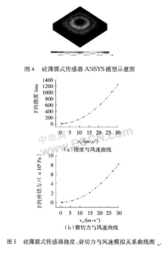 為了方便軟件模擬,簡(jiǎn)化了所設(shè)計(jì)傳感器的模型。薄膜的厚度取10μm,2000 μm×2000μm的正方形,空腔的厚度取330μm。圖4為帶有薄膜形變的ANSYS模型。薄膜的模型用Solid45,流體模型應(yīng)用FLUID142,風(fēng)速?gòu)?~30 m/s間隔變化。通過(guò)模擬得到了薄膜最大形變、最大應(yīng)力與風(fēng)速的關(guān)系曲線,見(jiàn)圖5。分析模擬所得的數(shù)據(jù),可知薄膜撓度和剪切力都與風(fēng)速成二次關(guān)系,與薄膜式傳感器的理論分析相一致。