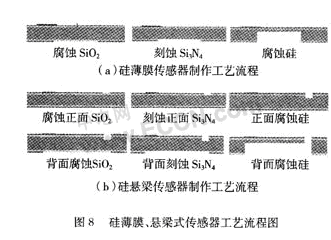 兩種傳感器擬采用基于MEMS的體硅工藝,應(yīng)用正背面異向濕法刻蝕和背面深刻蝕形成薄膜或懸梁。薄膜設(shè)計(jì)為10μm厚,200 μm×2000 μm的正方形;懸梁設(shè)計(jì)為10μm厚,1500 μm長(zhǎng),500 μm寬。采用雙面拋光n型(76 mm)100硅片厚度350 μm。硅片清洗后,用熱氧化工藝制作一層氧化硅,再用LPCVD工藝制作一層氮化硅;之后濺射Pt電極,采用lift-off工藝去掉不需要的Pt金屬。完成以上步驟后,薄膜式傳感器直接在背面腐蝕形成薄膜,完成傳感器的制作;懸梁式傳感器需要先在正面腐蝕出10μm的深坑,后在背面先濕法腐蝕5 h深度達(dá)到200μm,再深刻蝕直到出現(xiàn)圖形。其過(guò)程如圖8。