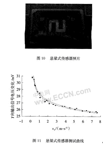 依據(jù)所設(shè)計(jì)的原理及工藝流程,首先制作了懸梁式測(cè)風(fēng)傳感器如圖10所示。傳感器為雙懸梁結(jié)構(gòu),通過(guò)惠斯通電橋輸出傳感器測(cè)量信號(hào),其測(cè)試圖如圖11所示。