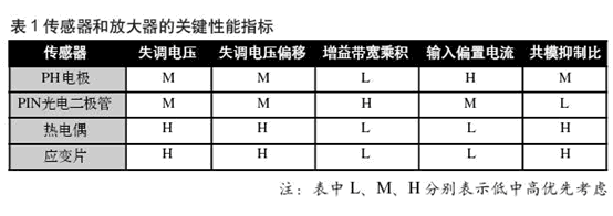 選擇放大器與傳感器正確接口時(shí),設(shè)計(jì)人員必須使放大器與傳感器特性匹配。可靠的放大器特性對于傳感器——放大器組合的工作是關(guān)鍵性的。傳感器和放大器的關(guān)鍵性能指標(biāo)見表1。例如,PH電極是一個(gè)高阻抗傳感器,所以,放大器的輸入偏置電流是優(yōu)先考慮的(表中的H)。PH傳感器所提供的信號不允許產(chǎn)生任何相當(dāng)大的電流,所以,放大器必須是在工作時(shí)不需要高輸入偏置電流的型號。具有低輸入偏置電流的高阻抗MOS輸入放大器是符合這種要求的最好選擇。另外,對于應(yīng)用增益帶寬乘積(GBP)是低優(yōu)先考慮(表1中L),這是因?yàn)閭鞲衅鞴ぷ髟诘皖l,而放大器的頻率響應(yīng)不應(yīng)該妨礙傳感器信號波形的真正再生。