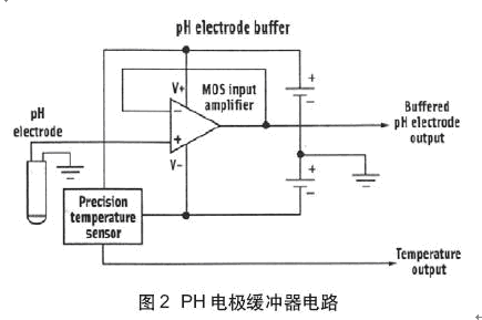 高阻抗PH傳感器可與具有低功率電路(僅需要2個(gè)1.5V電池供電)的放大器配對(圖2)。放大器MOS輸入晶體管為傳感器提供高阻抗,傳感器輸出阻抗為1MW或更大。此放大器的輸入偏置電流小于1pA,所以,放大器工作消耗非常小的電流。放大器的失調(diào)電壓小于1mV。放大器提供軌到軌工作并具有高驅(qū)動(dòng)能力,能在長線上發(fā)送信號(放大器遠(yuǎn)離ADC的情況)。在電路中增加了一個(gè)精密溫度傳感器,可以測量PH傳感器的溫度。這使得具有精確的PH溫度補(bǔ)償值。