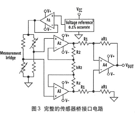 測量應(yīng)變片傳感器通常要通過橋網(wǎng)絡(luò),應(yīng)變片構(gòu)成橋的兩個(gè)(或4個(gè))臂。應(yīng)變片是低源阻抗器件,其輸出信號范圍是小的(幾百微伏~幾毫伏)。圖3所示的電路能為精確測量傳感器信號提供測量橋穩(wěn)定激勵(lì)電壓和高共模電壓抑制(CMR),消除了任何共模電壓。用高精度和非常低漂移(隨溫度)的精密電壓基準(zhǔn)驅(qū)動(dòng)放大器A1。這可為橋提供非常精確、穩(wěn)定的激勵(lì)源。因?yàn)楣材k妷捍蠹s為激勵(lì)電壓的一半,所以被測信號僅僅是橋臂之間小的差分電壓。放大器A2、A3、A4必須提供高共模抑制比(CMRR),所以僅測量差分電壓。這些放大器也必須具有低值輸入失調(diào)電壓(VOS)漂移(也稱之為失調(diào)電壓溫度系數(shù)TCVOS)和輸入偏置電流,以使得從傳感器能精確地讀數(shù)。放大器A1~A4連接成儀表放大器以達(dá)到上述目標(biāo)。這種配置的電壓增益(AV)為:AV=(1+2R2/bR2)(aR1/R1),其中a和b是確定總增益的比值。