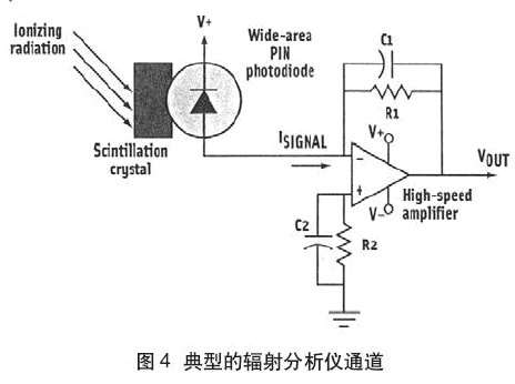 輻射譜測量來自輻射源的發(fā)射能量的分布,輻射源可以是粒子,X射線或γ射線。輻射照到閃光晶體上并發(fā)射強(qiáng)度正比于能量的短脈沖。然后由PIN光電二極管把光轉(zhuǎn)換為電流。放大器(見圖4)用做首置放大器和PIN光電二極管輸出的電流/電壓轉(zhuǎn)換器。此電路為用于基本輻射譜的單通道分析儀。信號的脈沖幅度包含重要信息,所以低輸入失調(diào)電壓和低失調(diào)電壓漂移是重要的。寬帶寬為處理脈沖(可窄到幾納秒)提供快速響應(yīng)。首置放大器輸出(VOUT)到脈沖幅度分析儀(如快速ADC)來測量和儲存每個(gè)峰值發(fā)生的數(shù)。分布是單個(gè)源的光譜。反饋電阻R1值取決于來自PIN光電二極管的最大電流和到ADC的最大輸出電壓。因此,R1=(Max VOUT)/(Max ISIGNAL)。電容C1用于PIN光電二極管寄生電容的補(bǔ)償。R2和C2相當(dāng)于R1和C1用于補(bǔ)償放大器非倒相輸入的輸入偏置電流。
