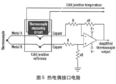 熱電偶根據(jù)兩個(gè)不同金屬線結(jié)點(diǎn)之間的溫度差提供電壓信號。熱電偶溫度傳感器具有一個(gè)感測端(金屬A/金屬B連接端)和一個(gè)參考端(金屬A和金屬B與銅導(dǎo)線連接端)。冷端參考溫度與熱電偶信號一道進(jìn)行控制和測量。熱電偶具有大約10mV/℃~80mV/℃的小信號電平范圍和小的源阻抗。配置成差分放大器的單放大器(圖5)把信號放大到ADC輸入所需的電平。差分放大器增益為: