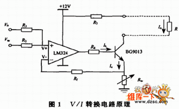 電壓/電流轉(zhuǎn)換即V/I轉(zhuǎn)換,是將輸入的電壓信號(hào)轉(zhuǎn)換成滿足一定關(guān)系的電流信號(hào),轉(zhuǎn)換后的電流相當(dāng)一個(gè)輸出可調(diào)的恒流源,其輸出電流應(yīng)能夠保持穩(wěn)定而不會(huì)隨負(fù)載的變化而變化。V/I轉(zhuǎn)換原理如圖1。