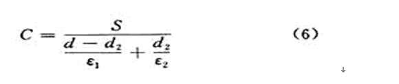 顯然,在電容器極板的遮蓋面積S,兩極板之間的距離d,被測(cè)物體上下側(cè)至電極之間介質(zhì)的介電常數(shù)ε1和ε3確定時(shí),電容量的大小就和被測(cè)材料的厚度d2及介電常數(shù)ε2有關(guān)。如被測(cè)材料介電常數(shù)ε2已知,就可以測(cè)量等厚教材料的厚度d2;或者被測(cè)材料的厚度d2已知,就可測(cè)量其介電常數(shù)ε2。這就是電容式測(cè)厚儀和電容式介電常數(shù)測(cè)量?jī)x的工作原理。