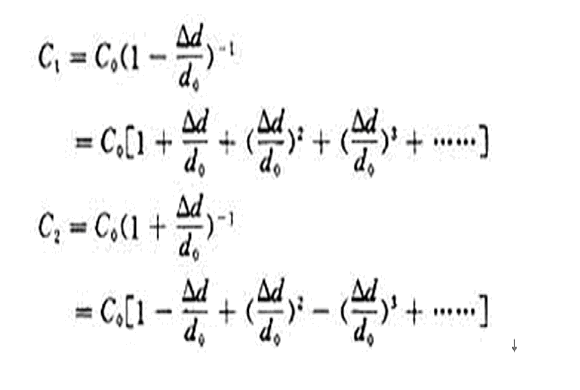 雖然電容的變化量仍舊和位移Δd成非線性關(guān)系,但是消除了級(jí)數(shù)中的偶次項(xiàng),使線性得到改善。當(dāng)