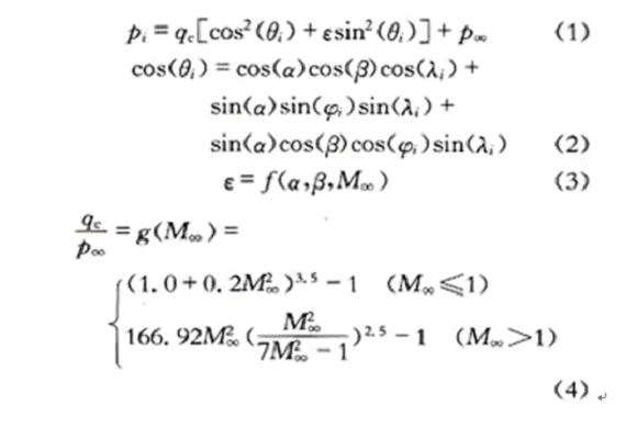 FADS系統(tǒng)的空氣動力學模型把位流模型與修正的牛頓流模型(前者主要適用于亞音速條件,后者主要適用于超音速條件)與一個修正系數(shù)ε相結(jié)合,形成了不同馬赫情況下的帶補償?shù)目諝鈩恿W模型。ε的數(shù)值是在綜合考慮了壓縮效應、氣動外形、系統(tǒng)影響等因素而選取的。在飛行中,可以將其看成攻角、側(cè)滑角和馬赫數(shù)的函數(shù),其函數(shù)關(guān)系可以在飛行前確定。