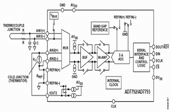 圖1給出利用3通道、16/24位AD7792/AD7793Σ-Δ模數(shù)轉(zhuǎn)換器(也可以使用6通道AD7794/AD7795)的熱電偶系統(tǒng)。其片內(nèi)儀表放大器首先對(duì)熱電偶電壓進(jìn)行放大,然后通過模數(shù)轉(zhuǎn)換器對(duì)放大的電壓信號(hào)進(jìn)行模數(shù)轉(zhuǎn)換。熱電偶產(chǎn)生的電壓偏置在地電平附近。片內(nèi)激勵(lì)電壓源將其偏置到放大器線性范圍以內(nèi),因此系統(tǒng)能夠利用單電源工作。這種低噪聲、低漂移、片內(nèi)、帶隙基準(zhǔn)電壓源,能夠確保模數(shù)轉(zhuǎn)換的精度,從而保證整個(gè)溫度測量系統(tǒng)的精度。
