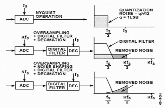 圖4.過取樣、數(shù)字濾波、噪聲整形和采樣抽取對(duì)噪聲頻譜的影響