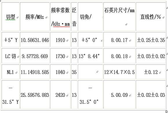 石英晶體的頻率溫度特性方程為:f=fO(1+aΔT+bΔT2+cΔT3),由此可見,通過切角的選擇,使系數(shù)b和c接近于零,可提高頻率溫度的線性度。石英晶體溫度計(jì)就是利用石英晶體的頻率溫度特性原理制成的。最先采用的為+5°Y切型,后來美國(guó)發(fā)明了溫度特性極好的LC切型,日本發(fā)明了NL切型,東洋通信研制的-31.5°Y切型的詳情見表1。
