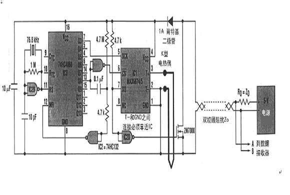 由于EMI與線長(zhǎng)度成正比,所以使噪聲最小的通常選擇是把控制電路靠近感測(cè)點(diǎn),增加1個(gè)靠近感測(cè)點(diǎn)的遠(yuǎn)程板或采用復(fù)雜的信號(hào)濾波和纜線屏蔽。1個(gè)比較妙的方案是在靠近感測(cè)點(diǎn)數(shù)字化熱電偶輸出(圖1).