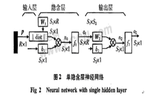 其中,p為輸入矢量,R為輸入矢量維數(shù),S1為隱含層神經(jīng)元個數(shù),S2為輸出層神經(jīng)元個數(shù),W1為隱含層神經(jīng)元權(quán)值矩陣,W2為輸出層權(quán)值矩陣,b1為隱含層神經(jīng)元閥值,b2為隱含層神經(jīng)元閥值,n1為隱含層輸入節(jié)點,n2為輸出層節(jié)點。f1為S型函數(shù),f2為purelin型函數(shù)。神經(jīng)網(wǎng)絡(luò)算法是用于前饋多層網(wǎng)絡(luò)的學(xué)習(xí)算法。如果輸出不能得到期望的輸出,則轉(zhuǎn)入后向傳播。通過誤差的后向傳播調(diào)整各層之間的權(quán)系數(shù)。反復(fù)輸入樣本序列,直至權(quán)系數(shù)不在改變?yōu)橹?,輸出誤差在規(guī)定的范圍之內(nèi)。算法采用如下改進(jìn):1)采用模擬退火法以克服局部最??;2)用奇函數(shù)作激勵函數(shù)和傳播過程中采用新誤差傳播因子完善該算法收斂性問題。