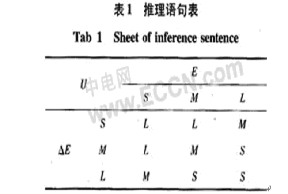 基于神經(jīng)網(wǎng)絡(luò)在推理方面不足,故借助于模糊控制強大的推理功能,提取有效的條件語句,進(jìn)而加快網(wǎng)絡(luò)的訓(xùn)練速度。選取偏差E和偏差變化率△E作為輸入和控制量U作為輸出。偏差E和偏差變化率△E的模糊量分別為大(L),中(M),小(S),創(chuàng)立描述條件推理表格如表1。