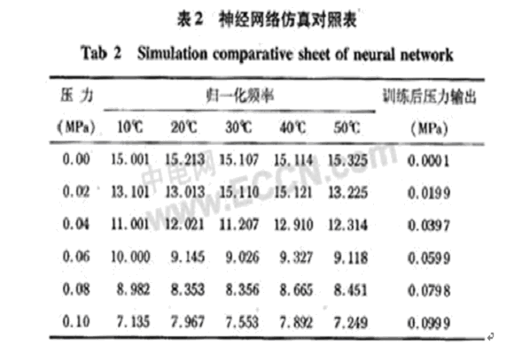 境下進(jìn)行神經(jīng)網(wǎng)絡(luò)的訓(xùn)練和仿真,通過神經(jīng)網(wǎng)絡(luò)工具箱,編制相應(yīng)的仿真訓(xùn)練程序,實現(xiàn)仿真過程。在仿真時,隨機選取幾組頻率-溫度作為輸入,最后,進(jìn)行標(biāo)定壓力值和仿真結(jié)果的比較。仿真數(shù)據(jù)結(jié)果如表2。