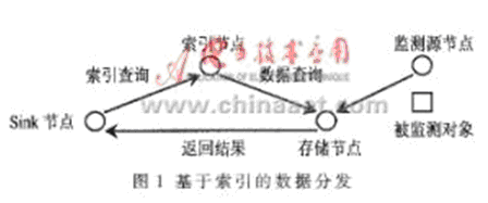 (4)基于索引的數(shù)據(jù)分發(fā)方案(index-based data dissemination scheme)[3],這種方案克服了以上幾種方案存在的問(wèn)題。在這種方案中,負(fù)責(zé)監(jiān)測(cè)某對(duì)象的源節(jié)點(diǎn)定期產(chǎn)生該監(jiān)測(cè)對(duì)象的感知數(shù)據(jù),并存儲(chǔ)到存儲(chǔ)節(jié)點(diǎn)上,存儲(chǔ)節(jié)點(diǎn)可能是該源節(jié)點(diǎn),也可能是鄰近的某個(gè)節(jié)點(diǎn)。同時(shí),存儲(chǔ)節(jié)點(diǎn)的位置信息(稱(chēng)為索引),要增加到索引節(jié)點(diǎn)上。當(dāng)sink節(jié)點(diǎn)想查詢(xún)某個(gè)被監(jiān)測(cè)對(duì)象產(chǎn)生的感知數(shù)據(jù)時(shí),就發(fā)送一條查詢(xún)消息給有關(guān)的索引節(jié)點(diǎn),索引節(jié)點(diǎn)收到該消息后轉(zhuǎn)發(fā)查詢(xún)請(qǐng)求給相應(yīng)的存儲(chǔ)節(jié)點(diǎn),由存儲(chǔ)節(jié)點(diǎn)直接發(fā)送查詢(xún)結(jié)果給sink節(jié)點(diǎn)。其基本思想如圖1所示。這種數(shù)據(jù)分發(fā)方案避免了發(fā)送不需要的感知數(shù)據(jù),也不需要把控制信息泛洪到整個(gè)網(wǎng)絡(luò),改善了整個(gè)系統(tǒng)的性能,但是增加了維護(hù)索引節(jié)點(diǎn)的額外費(fèi)用。