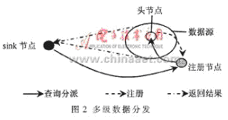 (5)多級(jí)數(shù)據(jù)分發(fā)方案(multi-resolution data dissemination scheme)[4],綜合了LS和DCS數(shù)據(jù)分發(fā)方案的技術(shù)。其基本思想是在數(shù)據(jù)源中選擇一個(gè)頭節(jié)點(diǎn),代表源節(jié)點(diǎn)在最近的注冊(cè)節(jié)點(diǎn)上進(jìn)行注冊(cè)。sink節(jié)點(diǎn)把查詢(xún)發(fā)送到所有注冊(cè)節(jié)點(diǎn)上,從注冊(cè)節(jié)點(diǎn)再把查詢(xún)發(fā)送到所有匹配的頭節(jié)點(diǎn),當(dāng)頭節(jié)點(diǎn)收到查詢(xún)后,在數(shù)據(jù)源內(nèi)選擇一組節(jié)點(diǎn)進(jìn)行查詢(xún)。由于sink節(jié)點(diǎn)的位置包含在它分派的查詢(xún)中,查詢(xún)節(jié)點(diǎn)可以直接把感知數(shù)據(jù)發(fā)送給sink節(jié)點(diǎn),其基本思想如圖2所示。這種數(shù)據(jù)分發(fā)方案避免了查詢(xún)泛洪,能有效減少能量消耗。但是在數(shù)據(jù)源中只是基于感知范圍參數(shù)來(lái)選擇查詢(xún)節(jié)點(diǎn),沒(méi)有考慮數(shù)據(jù)的分布情況。