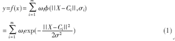 RBF神經(jīng)網(wǎng)絡(luò)即徑向基函數(shù)(Radial Basis Function)神經(jīng)網(wǎng)絡(luò)[3~4],其結(jié)構(gòu)如圖3所示。它很容易擴(kuò)展到多輸出節(jié)點(diǎn)的情形,在此只考慮一個輸出變量Y的情況。RBFNN包括一個輸入層、一個隱含層和一個輸出層的最簡模式。隱含層由一組徑向基函數(shù)構(gòu)成,與每個隱含層節(jié)點(diǎn)相關(guān)的參數(shù)向量為Ci(即中心)和σi(即寬度)。徑向基函數(shù)有多種形式,一般取高斯函數(shù)[5]。具體如下: