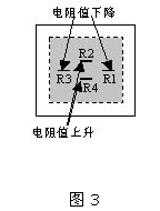 如圖2(b)所示,當(dāng)向空腔部分加上一定的壓力時(shí),膜片受到一定程度的拉伸或收縮而產(chǎn)生形變。壓電電阻的排列方法如圖3所示,受到拉伸的電阻R2和R4的阻值增加;受到壓縮的電阻R1和R3阻值減小。