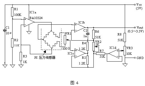 由于橋路失衡時(shí)的輸出電壓比較小,所以必須用運(yùn)放IC1b和IC1C來(lái)進(jìn)行放大。圖中VR1為偏置調(diào)整,VR2為壓力靈敏度調(diào)整,VR3為沒有加壓時(shí)輸出電壓調(diào)整,C1、C2用于去除噪聲。另外,如果電源電壓波動(dòng)的話,將引起輸出電壓的變化,所以必須給電路提供一個(gè)穩(wěn)定的電源。