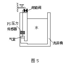 圖5是PS壓力傳感器在全自動(dòng)洗衣機(jī)中的應(yīng)用實(shí)例。如圖所示,利用氣室,將在不同水位情況下水壓的變化,作為空氣壓力的變化檢測(cè)出來(lái),從而可以在設(shè)定的水位上自動(dòng)停止向洗衣機(jī)注水。