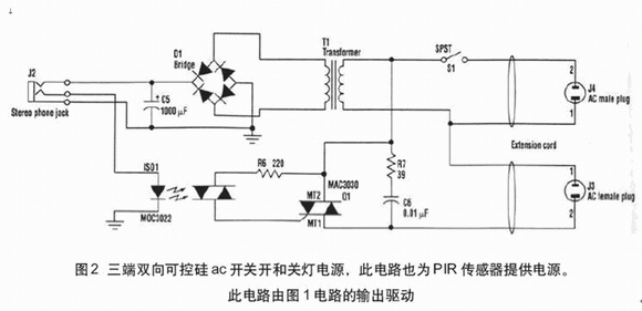 圖2示出三端雙向可控硅控制的ac開關,此電路也為PIR供電提供非穩(wěn)壓12~14Vdc。通過匹配的電話插口由來自圖1電路的輸出脈沖驅動三端雙向可控硅開關。用標準立體聲音頻纜線連接兩個電路。