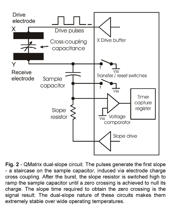 QMatrix器件采用一個(gè)掃描式的橫向電極無(wú)源矩陣,實(shí)現(xiàn)了使用單芯片驅(qū)動(dòng)的大量觸摸按鍵。這種構(gòu)造可提高感測(cè)芯片的引腳利用效率,較之于每個(gè)按鍵都需要一個(gè)感測(cè)連接 (如 Qtouch™ 及許多同類(lèi)器件),芯片和按鍵矩陣之間所需的連接數(shù)量較少。QMatrix 器件所需的部件最少,最大限度地降低了單個(gè)按鍵的成本。在量產(chǎn)時(shí),此器件可以令芯片成本降至每按鍵 0.05 美元。此外,這種構(gòu)造本身就具有抵抗環(huán)境變化、水膜影響以及無(wú)線電干擾的特性。