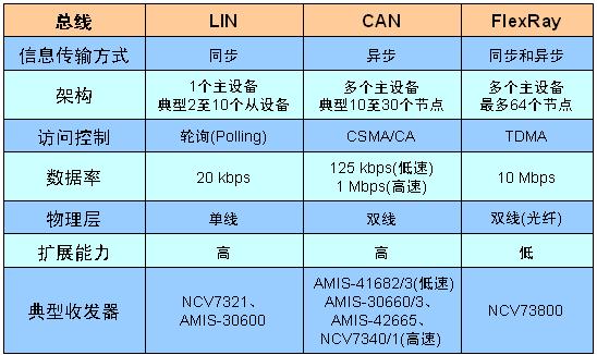 可以應(yīng)用于汽車中的系統(tǒng)總線有多種,如控制器區(qū)域網(wǎng)絡(luò)(CAN)、本地互連網(wǎng)絡(luò)(LIN)及FelxRay等。這些總線的特點(diǎn)各不相同,表1比較了汽車應(yīng)用中幾種常見的系統(tǒng)總線,并列出了典型的安森美半導(dǎo)體總線收發(fā)器產(chǎn)品。