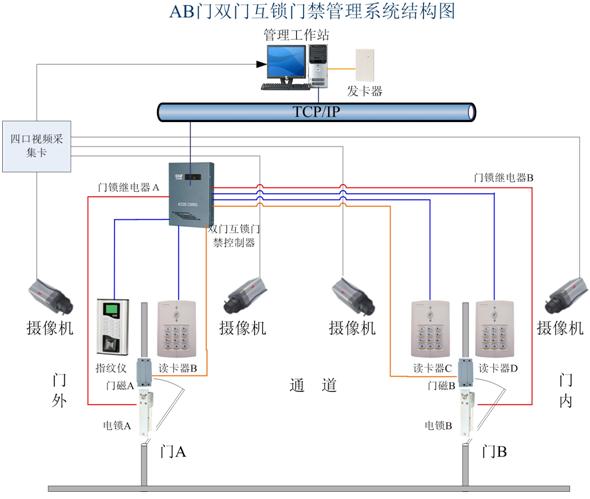 首先解釋一下AB門雙門互鎖的概念,所謂雙門互鎖聯(lián)動是指AB兩道門具有互鎖聯(lián)動的功能,即當一道門被打開時,另一道門將打不開,只有當兩道門都關上時,才能打開其中的任一道門。在高安全場所通道門禁應用中,特定人員進入第一道門后必須要按照操作要求鎖好第一道門才能進入第二道門,如進入第一道門后沒按要求關好此道門,將不能進入第二道門,這樣做的目的是為了防止犯罪分子尾隨作案。