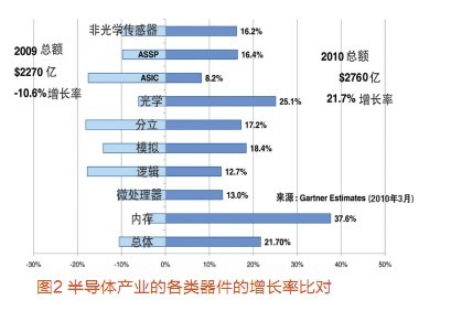 Gartner公司調(diào)查總監(jiān)Stephan Ohr從宏觀上分析了MEMS的增長態(tài)勢。Gartner把MEMS分為光學和非光學兩大類。光學MEMS如TI公司的DLP(數(shù)字投影芯片)。非光學MEMS傳感器年增長率16.2%(圖2),2010年市場容量會突破30億美元,有望達到31億美元;2009年為28億美元。其中,汽車應用仍然保持非光學傳感器的第一位,占2009年總應用中的60%以上;但是數(shù)據(jù)處理和通信應用增長最快,數(shù)據(jù)處理包括硬盤的G-Force(重力)傳感器,通信中包括手機的可旋轉(zhuǎn)(rational)的傳感和基于位置的服務。