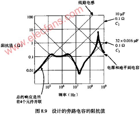 上式計(jì)算了圖8.9中電容C2和電容陣列C3的曲線。圖8.9中假設(shè)C2和C3電容陣列的每個(gè)元件的ESR都為0.1歐,總的電路板面積為10IN的2次方,電源的和地之間有0.01IN厚的FR-4電介質(zhì)。