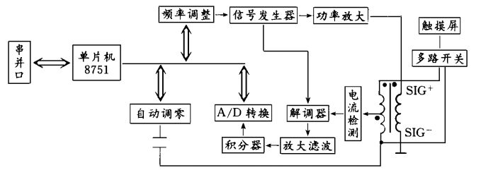加到觸摸屏的右邊電極上,觸摸屏的上邊和下邊電極全部開路,這樣在觸摸屏的X 方向上建立了交流電壓梯度,經(jīng)解調(diào)器解調(diào)和濾波后,可得到X 方向上的觸摸電流為iX= KXXV/ Zf ,其中,V為變壓器次級對于中心抽頭虛地的電壓,KX 為常量,V/ Zf 為電路等價(jià)阻抗觸摸電流。第2 種模式為將SIG+加到觸摸屏的左邊電極上,同時(shí)也加到觸摸屏的右邊電極上,這時(shí)在X 方向上建立了均勻的交流電壓。如果在觸摸屏上任意一點(diǎn)進(jìn)行觸摸,則經(jīng)解調(diào)器解調(diào)和濾波后,得到其觸摸電流為i ZX= KZXV/ Zf ,其中,KZX為常量。由iX 和iZX得X 方向的觸摸位置坐標(biāo)為X= (KZX/ KX)·( iX/ i ZX ) ,式中,iX、iZX在以上2 種掃描模式下測得,而常量KZX/ KX 可由實(shí)驗(yàn)確定。一旦確定了KZX / KX,就可計(jì)算出X 方向的任意觸摸位置坐標(biāo)X。同樣,第3 種模式是將SIG+和SIG-分別加到觸摸屏的上邊電極和下邊電極上,即可得到Y(jié)方向上的觸摸電流為i Y= KYYV/ Zf ,其中,KY 為常量。第4種模式是同時(shí)將SIG+加到觸摸屏的上邊電極和下邊電極上,得等價(jià)阻抗觸摸電流為 iZY= KZYV/ Zf ,其中,KZY為常量。也可由 iY 和 iZY得Y 方向的觸摸位置坐標(biāo)為 Y=(KZY/ KY) ( i Y/ i ZX) ,其中,常量KZY/ KY 同樣可由實(shí)驗(yàn)確定。