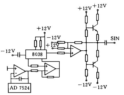 控制器的激勵(lì)信號源如圖3 所示。信號由函數(shù)信號發(fā)生器8038 產(chǎn)生,它能夠輸出正弦波和方波,正弦波用作觸摸屏的激勵(lì)信號。單片機(jī)通過 8 位 D/ A 轉(zhuǎn)換器可控制8038 的振蕩頻率,一般控制在200 kHz 左右,以避開計(jì)算機(jī)顯示器掃描信號產(chǎn)生的干擾。同時(shí),由8038 產(chǎn)生的方波信號提供給模擬解調(diào)器,作為解調(diào)信號參考源。由于8038輸出的正弦波信號功率有限,為此在8038的正弦波信號輸出端增加了功率放大電路。