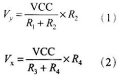 觸摸層的兩個(gè)金屬導(dǎo)電層分別用來測(cè)量X軸和Y軸方向的坐標(biāo)。用于X坐標(biāo)測(cè)量的導(dǎo)電層從左右兩端引出兩個(gè)電極,記為X+和X-。用于Y坐標(biāo)測(cè)量的導(dǎo)電層從上下兩端引出兩個(gè)電極,記為Y+和Y-。這就是四線電阻觸摸屏的引線構(gòu)成。當(dāng)在一對(duì)電極上施加電壓時(shí),在該導(dǎo)電層上就會(huì)形成均勻連接的電壓分布國。若在X方向的電極對(duì)上施加一確定的電壓,而Y方向電極對(duì)上不加電壓時(shí),在X平行電壓場(chǎng)中,觸點(diǎn)處的電壓值可在在Y+(或Y-)電極上反映出來,通過測(cè)量Y+電極對(duì)地的電壓大小,便可得知觸點(diǎn)的X坐標(biāo)值。同理,當(dāng)在Y電極對(duì)上加電壓,而X電極對(duì)上不加電壓時(shí),通過測(cè)量X+電極的電壓,便可得知觸點(diǎn)的Y坐標(biāo)。測(cè)量原理如圖1所示。