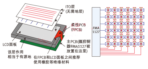 圖5:使用FMA1127實(shí)現(xiàn)的觸摸屏及PCB和觸摸屏的疊層安排。利用TDC比較由檢測(cè)電容形成RC延時(shí)線與基準(zhǔn)RC延時(shí)線的延時(shí)差別。使用差動(dòng)信號(hào)消除或降低了相關(guān)/相干噪聲源的影響,無(wú)需地層。