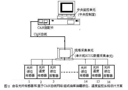 光纖傳感器與基于CAN總線網(wǎng)絡(luò)組成的油庫(kù)油罐的液位、溫度信號(hào)實(shí)時(shí)監(jiān)測(cè)系統(tǒng)設(shè)計(jì)方案