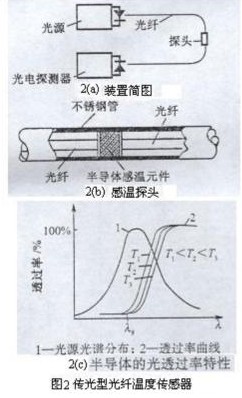位圖2(a)為半導(dǎo)體吸光型(傳光型)光纖溫度傳感器示意圖。將一根切斷的光導(dǎo)纖維裝在細(xì)鋼管內(nèi),光纖兩端面間夾有一塊半導(dǎo)體感溫薄片(如GaAs或InP),這種半導(dǎo)體感溫薄片透射光強(qiáng)隨被測(cè)溫度而變化。因此,當(dāng)光纖一端輸入一恒定光強(qiáng)的光時(shí),由于半導(dǎo)體感溫薄片透射能力隨溫度變化,光纖另一端接收元件所接受的光強(qiáng)也隨被測(cè)溫度而改變。于是通過(guò)測(cè)量光探測(cè)器輸出的電量,便能遙測(cè)到感溫探頭2(b)處的溫度。